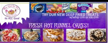 We offer a variety of flavors and toppings in all of our products. Some of our most popular items is Powdered Sugar Funnel Cakes, Strawberry Lemonade Water Ice and Nutty Buddy Ice Cream Cones